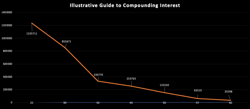 The above graph is based on someone investing 500 bucks a month with a 7% return and shows the projected return at 65, after investing from 25, 30, 42, 45, 50, 57 and 60. The later you start, the less you get.
